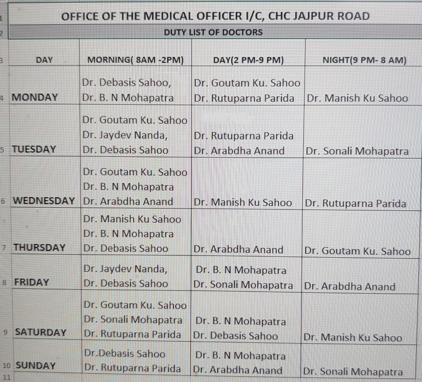 DUTY LIST OF DOCTORS FROM 12-02-2024 TO 18.02.2024 DUTY TIMEMORNING- 08:00 AM TO 02:00 PMDAY- 02:00 PM TO 08:00 PM